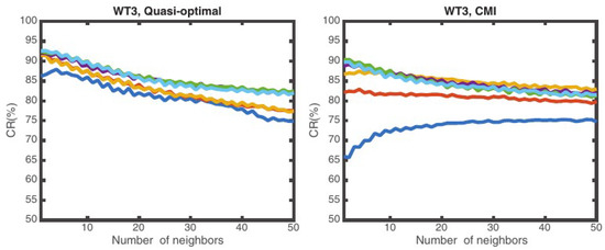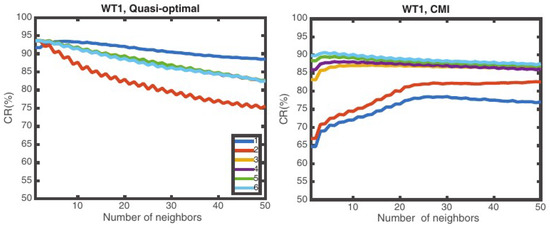 When analyzing the quasi-optimal case, k = 1 is the best option for all the WT. When using any of the automatic feature selection algorithms, if the number of features is small then the number of neighbors affects the CR and habitually k = 1 is not the best. Nevertheless, even increasing the number of neighbors, the obtained CR is lower that the QO case for the number of features analyzed. If the number of features increases, and therefore also the CR increases, k = 1 becomes again the best option and CR tends to the QO case. The advantage of increasing the neighbors is compensated by increasing the number of features. This effect can be observed in Figure 5: On the left column, the evolution of the CR as a function of k, for the quasi-optimal set of features (1 to 6) for WT1 and WT3, is presented. On the right column, the same WT but now using features obtained with the best feature selection algorithm among all the analyzed algorithms. Note that increasing the number of neighbors is only useful for the CMI algorithm when the number of features used is small (1 or 2), but does not help increase the CR when the number of features is larger. For the quasi-optimal feature selection algorithm, k = 1 is (almost) always the best option regardless of the number of features. Therefore, changing the number of neighbors has only impact when using 1 or 2 features in the CMI algorithm and degrades CR when the number of features is large or when the QO method is used.