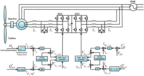 From Equations (8) and (9), one observes that the active and reactive powers can be controlled by the quadrature components of rotor current, considering the constant voltage. The converter controls the active and reactive powers of the DFIG stator, where / and is the magnetizing current.