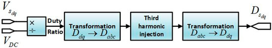 where D is the duty ratio, is the DC-link voltage, is the current flow into DC link, is the stator current is the stator voltage.
