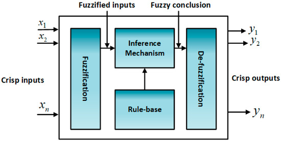 Control of traditional processes always depends on creating a mathematical model of the required system. An expert system was established to mimic the behavior of a skilled human operator for those processes too complex to be mathematically modeled in real time. Fuzzy logic controller (FLC) engines use as expert system paradigm for automatic process control. In addition, intuition and heuristics knowledge are also included into the system. This feature ranked FLC high in application where the existing models are ill defined, complex and not adequately reliable. FLC can mainly be classified into four main parts: fuzzifier, rules, inference engine and de-fuzzifier [34] as illustrated in Figure 5: