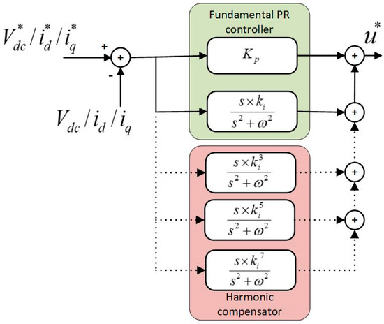 A PR controller has distinguished integration features. Due to the action of integration of frequencies near and around the resonance frequency; phase shift and static error do not occur in a PR controller. Although high order filters are used to obtain optimized current waves at the grid side during unbalanced grid conditions, in practical applications the current wave is not exactly the normal one, but has time varying elements of grid voltage with small deviations which result in poor THD of the feed-in current, but it is demanded in most grid standards [36,37] that the grid connected devices should be operated within certain frequencies range. To meet grid standards by improving the current quality a harmonic compensator is employed along with the PR controller as shown in Figure 7.