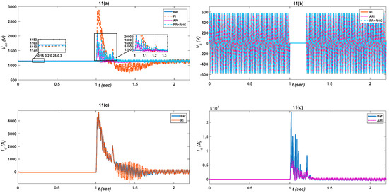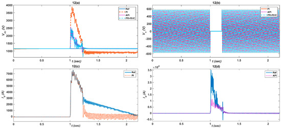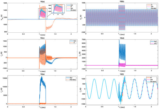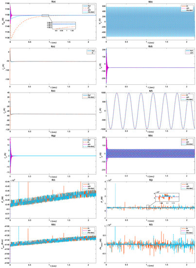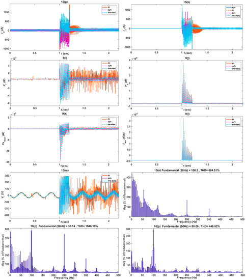 The grid voltage is dropped to 50% of its rated value for 200 ms from 1 s to 1.2 s during the under-voltage case, as illustrated in Figure 9b. The proposed controller response, shown in Figure 9a, is less oscillatory, fast, and robust for the API and PR+RHC algorithms, as compared to PI’s response which is unstable and out of limits. Figure 9c–e clearly shows that completely traces the reference value which indicates the robustness of the proposed (API & PR+RHC) strategies. The API controller updates its parameters using fuzzy rules to track the reference abruptly and the PR+RHC, due to its harmonic compensation, effectively minimizes the error, in comparison to the PI controller. The proposed controller responses in the case of is shown in Figure 9f. Figure 9g depicts having smooth response for the proposed controllers which gain stability soon after voltage the reaches a normal value. Figure 9h illustrates the response for the API & (PR+RHC) controllers with respect to the PI controller which ensures grid stability. The responses are described in Figure 9i,j which show that the API & (PR+RHC) controller responses are less oscillatory, and more stable as compared to the PI controller which reduces mechanical stress y as well as stress on drives.