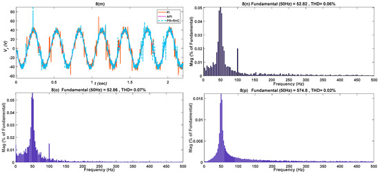 The , and responses for both the proposed and conventional strategy are shown in in Figure 9k–m. Finally, the robustness of the proposed controllers over the PI conventional controller was proved by harmonic spectrum analysis of , The THD value for the PI controller was 90.22% which is reduced to 61.20% and 66.16% in the case of the API and PR+RHC, respectively, and demonstrated in Figure 9n–p. The performance indices of all the control schemes are evaluated in Table 5, Table 6 and Table 7 for , , and , respectively. In the case of the API & PR+RHC controllers, all three parameter values are the minimum compared with the PI controller, which proves the better performance of the proposed controllers in under-voltage conditions.