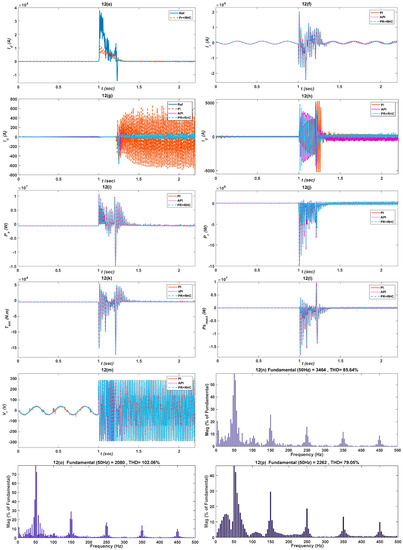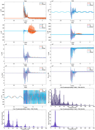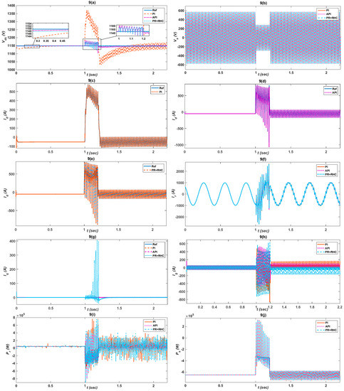 In over-voltage conditions the grid voltage is increased 50% of its rated value for 200 ms from 1 s to 1.2 s as shown in Figure 10b. The of the proposed controllers is robust, faster, and stable soon after the grid voltage recovers as shown in Figure 10a. for the PI, API and PR+RHC control controllers are clearly depicted in Figure 10c–e which prove that the proposed controllers are exactly following the reference value. Due to adaptiveness of the API and harmonic compensation of PR+RHC, both controllers are less sensitive to faults and the response is faster. are also depicted in Figure 10f for all controllers. In case, the responses in the API and PR+RHC controllers are fast and attain stability quickly after 1.2 s as shown in Figure 10g. Similarly , the API and PR+RHC controller responses are fast and achieve stability soon after 1.2 s, while the PI controller responds after 1.5 s as elaborated in Figure 10h. The proposed controllers’ responses in the case of and is less oscillatory and stable, which ensures stable performance is shown in Figure 10i,j. The proposed controllers’ performances in the case of , and are also dominant and less harmonic as shown in Figure 10k–m. Finally, THD of is calculated, which is 1046.10% using the PI controller while it reduces to 446.52% and 684.51% in the case of the API and PR+RHC controllers which makes the proposed controllers more reliable and efficient in over-voltage conditions as shown in Figure 10n–p. The performance indices of all the control schemes are evaluated in Table 8, Table 9 and Table 10 for , , and , respectively. In the case of the API and PR+RHC controllers, all three parameters values are minimum compared with the PI controller, which validates the better performance of the proposed controllers.