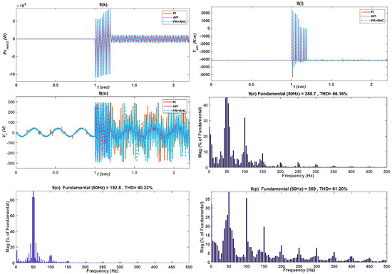 Comparison of PI and Proposed API and PR+RHC controllers responses under rated voltage, considering: (a) Dc-link voltage ; (b) Stator voltage ; (c–e) Active component of current ; (f) Rotor current ; (g) Reactive component ; (h) Grid current ; (i) Stator active power ; (j) Rotor active power ; (k) Electromagnetic torque ; (l) Stator reactive power ; (m) Rotor voltage ; (n) PR+RHC controller THD; (o) PI controller THD; (p) API controller THD.