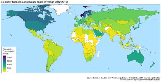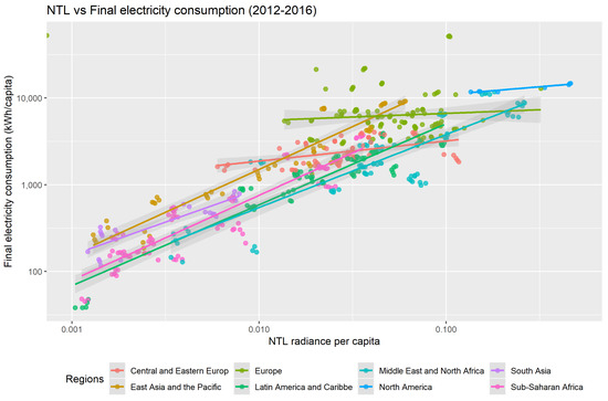 Electricity consumption data has been collected by the IEA World Energy Balance database [32], which represents the most reliable, standardized, and continuous available time series of energy data worldwide. For this study the electricity final consumption has been considered, by analyzing: (1) total final (shown in Figure 1), (2) residential and (3) commercial and public services consumption. The data is available with annual detail, and the most recent with a worldwide coverage area for the year 2016. For this reason, as they are only partially overlapping with the night-time light data, the analysis will be limited to the 2012–2016 period. Other sources provide more up-to-date information but on a limited number of countries (mainly OECD countries), and therefore they are less useful for the global scope of this research. The total number of countries considered amounts to 109, including 13 for Central and Eastern Europe, 11 in East Asia and the Pacific, 24 for Europe, 18 for Latin American and the Caribbeans, 16 for the Middle East and North Africa, two for North America, five for South Asia, and 20 for Sub-Saharan Africa). A caveat stems from the classification of the different typologies of power consumption: While the IEA aims at providing standard-quality data, there might still be differences in the accounting and categorization of power consumption between countries.