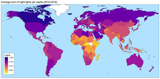 Subsequently, the raster files’ projection has been adjusted to a world cylindrical equal area (Lambert) projection (SR-ORG:8287) to enable a consistent computation, since the original file came in the standard EPSG:4326 projection, where the pixel resolution is of 450 m (the linear resolution equivalent of 15 arcseconds) at nadir but it changes as one moves away from the equator. The median annual value at each pixel has been considered, and the sum of the total radiance within each country has then been calculated for each country. The median has been favoured over the mean to discard anomalous months in terms of detected radiance. The figure has been divided by the national population, and has been defined as . The annual values of for each country are represented in Figure 2.