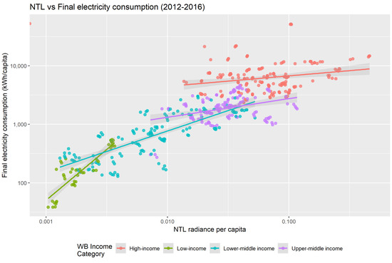 The graph supports the understanding of our results, as it sheds some light on the varying significance of lighting across income categories. Detected NTL radiance stems from public street and road lighting, and from private buildings. Satellite data has been found to be suitable to detect both public [38,39] and indoor light [40], and therefore can potentially shed useful information on both components.