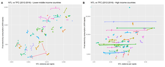 NTL vs. TFC for (A) lower-middle income and (B) high-income countries (annual values between 2012–2016). Each color represents a separate country.