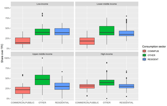 Figure 5 shows the distribution of the share of commercial and public electricity consumption (COMMPUB) and residential electricity consumption (RESIDENT) consumption over TFC by the four income categories considered. It shows how—as income increases—the spread between the two categories tends to close, with COMMPUB becoming dominant or comparable to RESIDENT in high-income countries.
