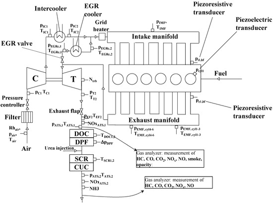 Scheme of the FPT Cursor 11diesel engine installed on the highly dynamic test bench in Arbon. The main measurement locations are also indicated.