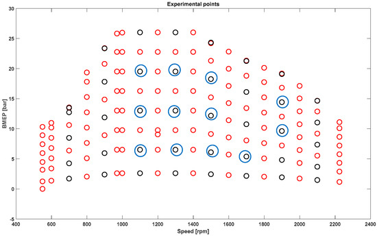 - a full engine map, carried out with pilot injection/EGR and without pilot injection/EGR (Figure 3, red circles).