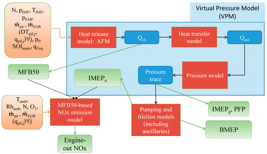Then, by using a heat transfer model, the net energy release (Qnet) is estimated, which in turn is used as input for the in-cylinder pressure model. The latter model is capable of estimating the in-cylinder pressure trace and the related metrics, such as IMEPg (gross Indicated Mean Effective Pressure) and PFP (Peak Firing Pressure).