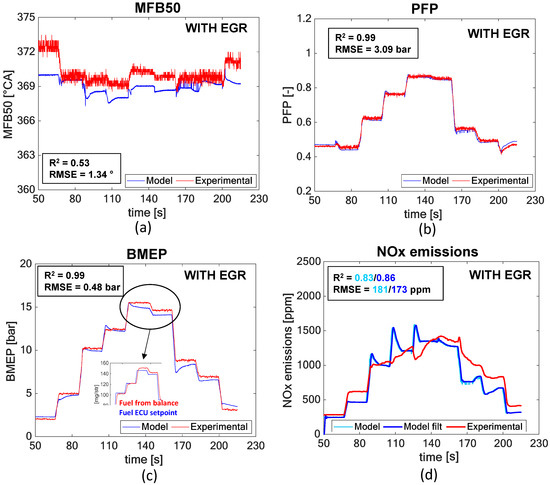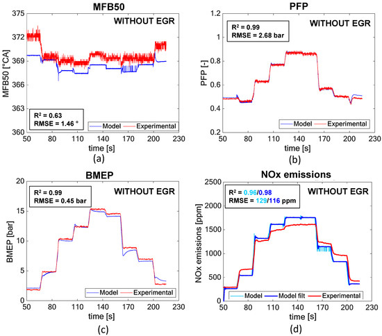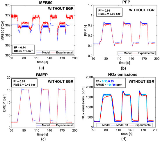 With reference to the NOx model, it can be seen from Table 6 that the engine-out NOx emissions as the sum of two contributions: the nominal NOx value ‘NOxN’, which represents the emissions when the engine operates at nominal conditions, and an NOx deviation term (‘δNOx’) which is null when MFB50 or intake O2 concentration deviate with respect to the nominal engine map values MFB50N and O2N.