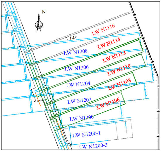 According to drillhole NBK26, the thickness of bedrock roof above the No. 1–2 seam is 70 m on average, while the alluvium (red soil) thickness is 94.7 m. Parameters of the coal, its roof and floor are listed in Table 1, and Figure 2 shows the longwall face arrangement.