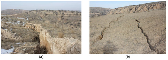 The ground surface is seriously damaged during SBCSM-S mining; (a,b) Mining-induced fractures.