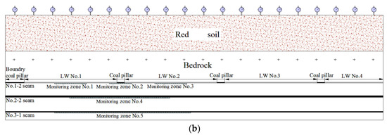 - Stress monitoring: In order to acquire the stress distribution of goaf and coal pillars after No. 1–2 seam mining, and analyse the stress distribution of two seams mining, the CL-YB-152 force test sensors were adopted with dimensions of 20 cm long × 2.5 cm wide × 1 cm high. They were located under the coal seams and divided into four monitoring zones (Figure 4b).