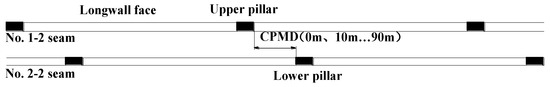 Firstly, No. 1–2 seam was excavated. It included three complete longwall faces (Figure 4b: ongwall face (LW) No.1, LW No.2 and LW No.3), and there were pillars (upper pillar) between the longwall faces. Their width is 245 m and that of the coal pillars is 20 m. Then, No. 2–2 seam was excavated; longwall face width and coal pillar (lower pillar) width is the same as No. 1–2 seam. By changing the CPMD of the two seams (from 0 m to 90 m), the three-field evolution characteristics based on different CPMD can be revealed. The CPMD of coal seams is shown in Figure 6.