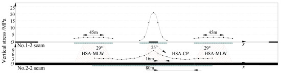 After mining of No. 1–2 seam, according to the data monitored in monitoring zones No. 1–4, the stress distribution characteristics of No. 1–2 and No. 2–2 seams are shown in Figure 7. The results show that the maximum vertical stress, concentrated at the center of upper pillar, is 20.56 MPa, and it is about 5.7 times the virgin in-situ stress, whereas, it gradually decreases to two sides. In addition, due to complete subsidence of the overlying strata, the vertical stress in the middle area (45 m) of the longwall face is also higher than the other position of goaf.