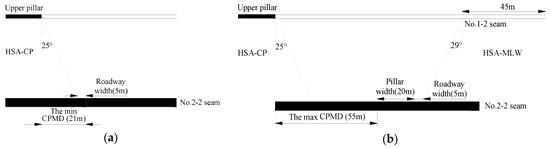 Affected by transmission stress of the upper pillar and goaf, the vertical stress of No. 2–2 seam is redistributed. According to the experiment, the maximum vertical stress of No. 2–2 seam, 8.61 MPa, is exactly concentrated under the upper pillar, and is also gradually decreased to two sides. The stress area under the upper pillar and larger than virgin in-situ stress (4.5 MPa) can be called a high stress area of coal pillar (HSA-CP). Figure 7 shows that the lower seam boundary of HSA-CP is 16 m (horizontal distance) from the upper pillar, and the stress transfer angle is 25°. If calculated with a roadway width of 5 m, the minimum CPMD avoiding HSA-CP is 21 m (Figure 8a).