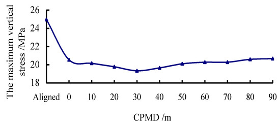 Through the simulation of No. 1–2 and No. 2–2 seams mining, and CPMD varying from 0 m to 90 m, Figure 9 shows the relationship between the maximum vertical stress evolution of the lower pillar and different CPMD.
