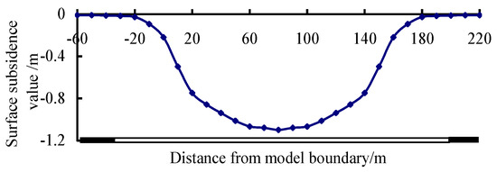 Figure 10 shows the overlying strata movement of No. 1–2 seam mining, and Figure 11 shows the surface subsidence curve. The caving angle of bedrock on both sides of the longwall face is 65°, whereas the caving angle of red soil is 70°; the largest surface subsidence value occurring above the center of the longwall face is 1.09 m.