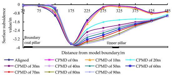 Figure 12 shows the surface subsidence curves of different CPMD. When the upper and lower pillars are aligned, or the CPMD is less than 10 m, the surface represents an obvious uneven subsidence, and the largest surface subsidence value of 3.648 m occurs above the center of No. 1–2 seam longwall face. The surface subsidence values occurring above the upper pillar are 0.128 m, 0.14 m and 0.218 m, respectively (aligned, CPMD of 0 m and 10 m); therefore, the largest subsidence drop height is 3.52 m. Based on the analysis above, when the CPMD is smaller than 10 m, the upper pillar is located at the support structure area of the lower pillar, and consequently results in smaller subsidence above the upper pillar, whereas the uneven subsidence drop height is large.