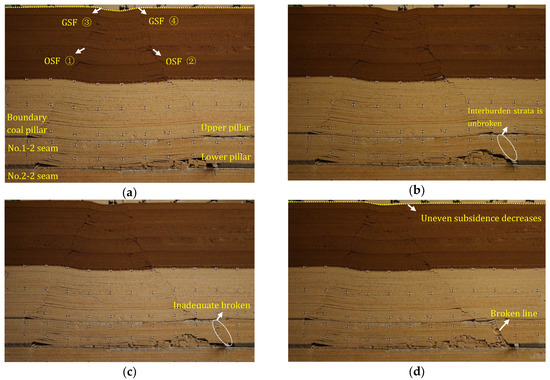 Figure 13 shows the fracture field evolution of different CPMD. The overlying strata fracture (OSF ① and ②), and the ground surface fracture (GSF ③ and ④) are defined. OSF ① and GSF ③ are above the boundary coal pillar, whereas, OSF ② and GSF ④ are above the coal pillar between the longwall face. When the CPMD is smaller than 10m, interburden strata between the upper and lower pillars is unbroken; OSF and GSF develops seriously, and the ground surface shows obvious uneven subsidence (Figure 13a,b). When the CPMD is 30 m, interburden strata is inadequately broken (Figure 13c). When the CPMD is larger than 40 m, the upper pillar subsides completely along the broken line (Figure 13d); OSF ② and GSF ④ obviously decrease, as does the uneven surface subsidence.
