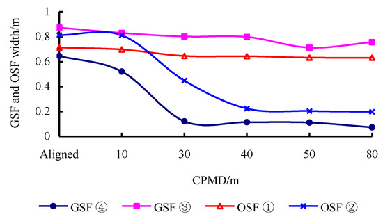 - The width of OSF ① is 0.661 m on average; it is also basically invariable as CPMD increases. However, the width of OSF ② decreases as the CPMD increases; when the coal pillars are aligned, its width is the largest (0.814 m). When the CPMD is larger than 40 m, the width of OSF ② is invariable as CPMD changes—0.209 m on average, and it decreases by 74.3% compared with the arrangement of the aligned pillars. Similarly, OSF ② belongs to controllable fractures, and the CPMD to control OSF ② should be larger than 40 m.