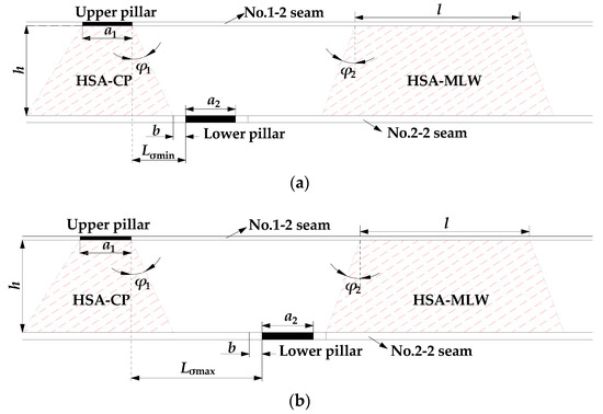 Based on physical simulation, stress field evolution in SBCSM-S mining was analysed above. Rational CPMD should simultaneously avoid HSA-CP and HSA-MLW. Therefore, a model of CPMD is established in Figure 17. Where, Lσmin is the minimum CPMD for controlling concentrated stress, m; Lσmax is the maximum CPMD, m; h is the thickness of interburden strata, m; a1 is upper pillar width, m; a2 is lower pillar width, m; b is the lower roadway width, m; φ1 is the stress transfer angle of HSA-CP, (°); φ2 is the stress transfer angle of HSA-MLW, (°); l is the range of HSA-MLW in No. 1–2 seam.