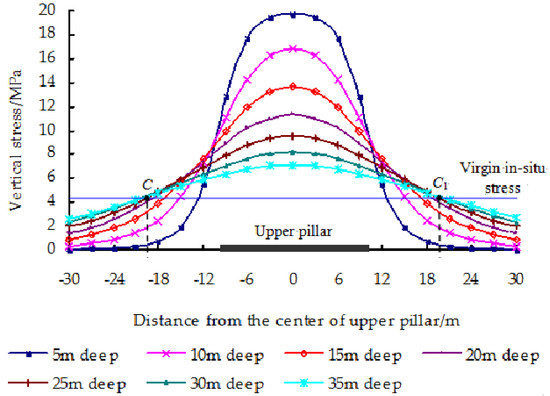 Based on Equation (5), if the position of point M (x, y) and uniform load q are known, vertical stress of point M can be solved. According to physical simulation, the maximum vertical stress of upper pillar is 20.56 MPa; consequently, q = 20.56 MPa, a1 = 20 m. Combining with Equation (5), distribution characteristics of vertical stress with different floor depth under the upper pillar is calculated and shown in Figure 19.