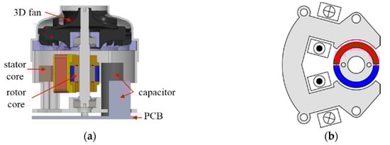 Research prototype of an inverter-driven single-phase brushless direct-current motor unit: (a) system profiles; (b) electromagnetic field structure of a single-phase BLDC motor.