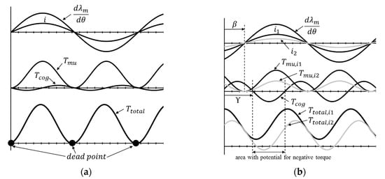 where , , , are current, flux linkage, flux, and reluctance, respectively. Also, , , are rotor position, phase angle in mutual torque, and cogging torque, respectively. From Equations (2) and (3), the rotor point at which the mutual and cogging torque is zero should be determined by the phase angle of and at each corresponding torque, respectively.