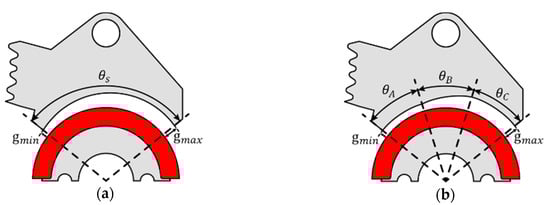 As given in Figure 3a,b, tapered and stepped types of asymmetric air gap are selected to design a single-phase BLDC motor. In Figure 3a, stator pole surfaces are tapered by using one arc with gradual changes in the length of air gap; in other words, the ratio of minimum to maximum length in air gap is varied. In Figure 3b, stepped air gap has the same ratio of minimum to maximum length as the tapered type, but there are three separate sections of air gap as , , and , illustrated in Figure 3b.