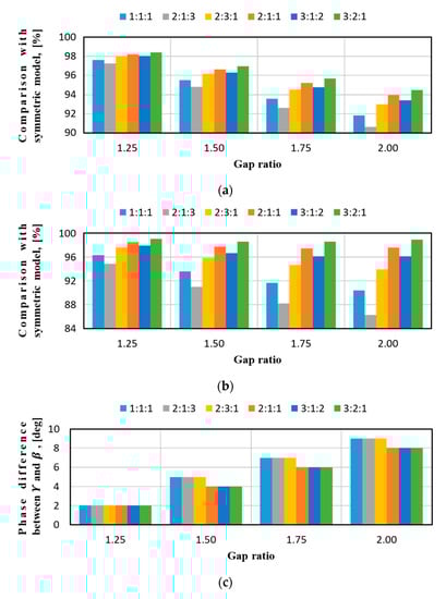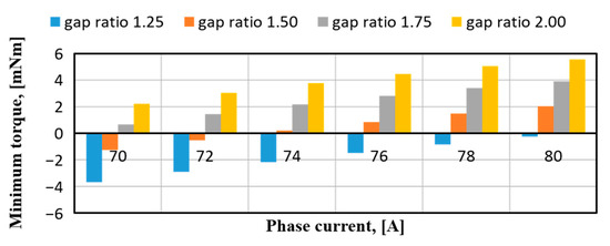In Figure 5a,b, the performance of stepped air gap is estimated in terms of ratio of length and angle in the case of no load. By increasing the region of and decreasing the region of compared to , back-EMF and cogging torque is improved, since the fraction of minimum air gap is proportional to average reluctance in its magnetic circuit. Figure 5c shows that phase angle between back-EMF and cogging torque is increasingly shifted as the angle of gets smaller, regardless of angles and , as given in Table 1. This is because cogging torque becomes zero at a point of minimum reluctance.