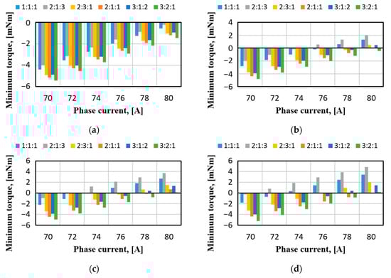 Minimum torque of stepped air gap with respect to DC current and angle ratio: (a) 1.25; (b) 1.50; (c) 1.75; (d) 2.00.
