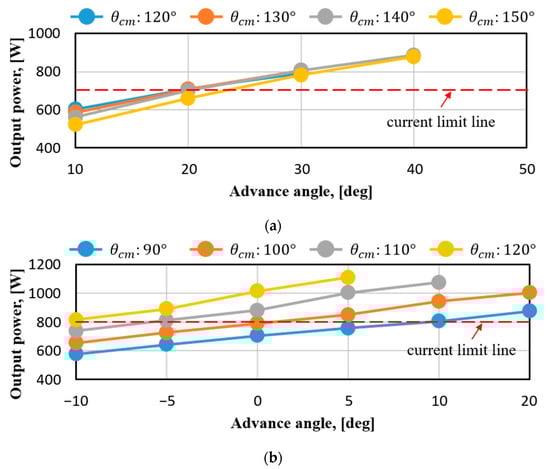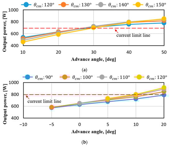 Output power of stepped air gap with respect to switching angles in case of battery voltage: (a) 20 V; (b) 26 V.
