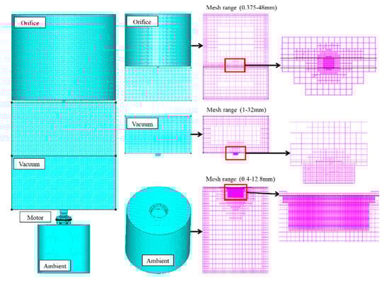 Figure 11 shows an entire simulation modeling to estimate the fluid dynamics of a single-phase BLDC motor assembled by the housing of Figure 1a inside a vacuum cleaner. The volume of the orifice and vacuum chambers is modeled as a cylinder with a diameter of 500 mm. However, the ambient part is much smaller than the orifice. The dimensions of all regions are set equal to the test conditions of a commercial cordless vacuum cleaner. More detailed simulation conditions for CFD analysis are described in the paper [13]. The efficiency of air flow is determined by the flow rate of air () and the average pressure of air on the entire surface of the vacuum (Pa), as given in Equation (4).