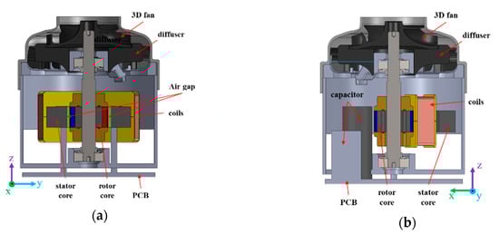 Figure 12 shows the assembly of a single-phase BLDC motor for a cordless vacuum cleaner and its cross-sectional view along the plane of y-z and x-z. In Figure 12b, it is seen that the placement of capacitors makes air flow asymmetric inside the housing. Therefore, in this paper, the effect of capacitors on air flow is calculated in terms of fluid dynamics by comparing CFD results with and without capacitors at the same time.