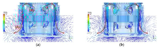 Computational fluid dynamic results of plane of x-z: (a) with capacitors; (b) without capacitors.