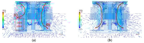 Computational fluid dynamic results of plane of y-z: (a) with capacitors; (b) without capacitors.