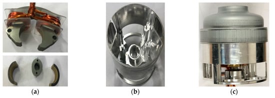 Prototype of single-phase BLDC motor for cordless vacuum cleaner: (a) stator and rotor assembly; (b) housing structure; (c) their assembly.