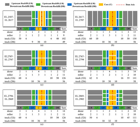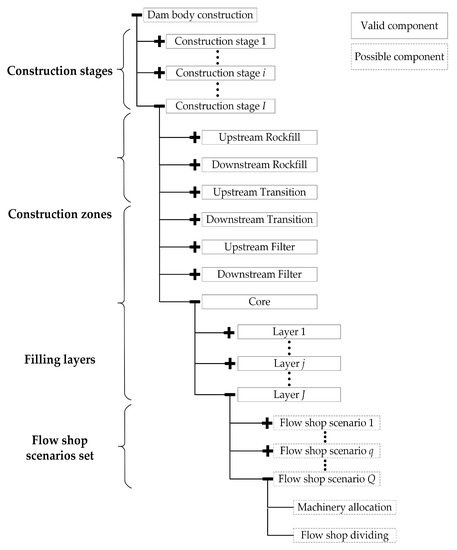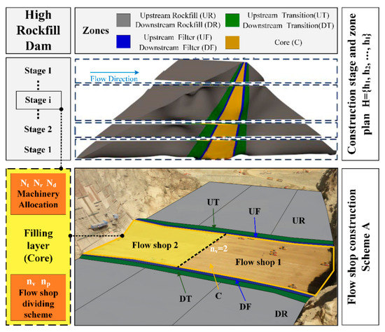 Hydropower is an advantageous option for clean energy. Rockfill dams have become a popular type of hydropower infrastructure because their raw materials are abundant [1,2]. In recent years, rockfill dams have grown in size, and their construction time may exceed a decade [3]. Therefore, the construction process of rockfill dams is divided into several stages to ensure an efficient and successful construction, while the dam body is divided into several zones for different functions. The arrangement of time for each stage and the division of zones by height represent the problem of the rockfill dam construction stage and zone optimization, which is critical in planning the construction process of rockfill dams. Figure 1 illustrates the work breakdown structure (WBS) of a high core rockfill dam construction as an example. Each zone is constructed in the sequence of filling layers, while each filling layer is constructed by means of flow shop. It is beneficial to determine a flow shop construction scheme derived from every filling layer’s alternative. Traditional design of the construction stages and zones is mainly based on expert experience of similar engineering [4], lacking scientific basis. To address this problem, a construction stage and zone optimization model was proposed in Reference [5]. Particle swarm optimization (PSO) and its enhanced variant, heterogeneous particle swarm optimization (HPSO), have been used to solve the optimization model [6,7,8]. However, these researches simplified the filling process of rockfill dam construction, resulting in the difficulty of obtaining the flow shop construction scheme.