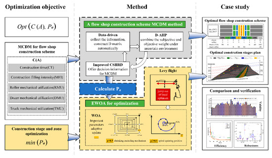 In this work, a construction stage and zone optimization model based on the data-driven D-AHP and EWOA is proposed, which can determine a preferable flow shop construction scheme for each filling layer while achieving the optimal construction stage and zone design. The research framework is composed of three levels: optimization objective, method, and case study, as shown in Figure 2.