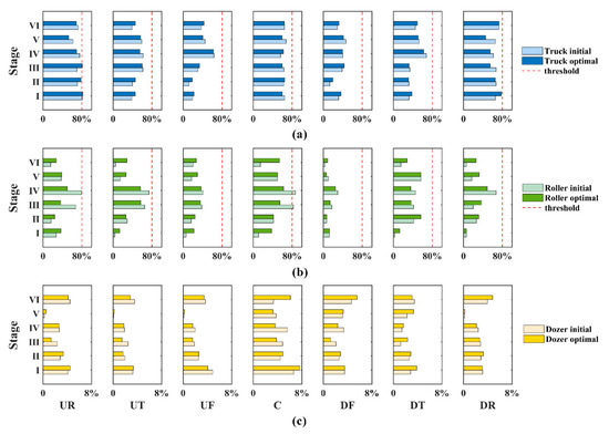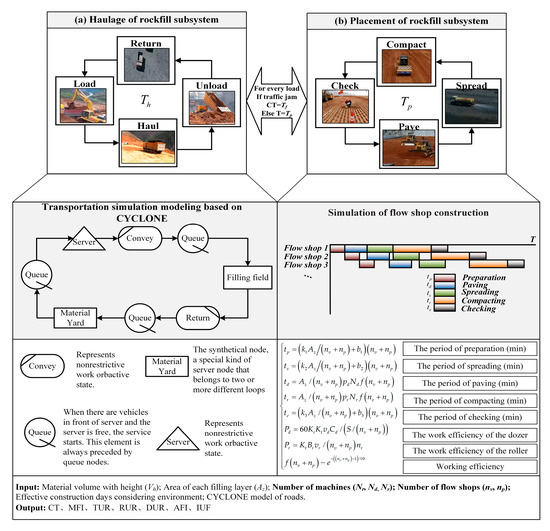 An improved CSHRD [16], which has been proven to accurately simulate the construction process, is implemented to calculate decision criteria. The improved CSHRD considers the haulage and placement of the rockfill subsystem. As shown in Figure 4, the haulage subsystem is simulated with CYCLONE, which provides constraints for the placement subsystem when the filling intensity exceeds the transport intensity. The placement subsystem simulates flow shop construction using the event marching method with the shortest time. In this process, the dam is constructed by filling layers, and each filling layer is divided into several flow shops according to the construction environment. The construction of each flow shop consists of five steps: unloading, paving, spreading, compacting, and checking. Assuming the placement of the rockfill subsystem is the dominant process at the beginning, construction time (CT) equals Tp. If the transport intensity of any road exceeds the prescribed transport intensity, then there is a traffic jam; the dominant process changes to haulage of the rockfill subsystem, and the construction time (CT) equals Th. Based on the improved CSHRD, evaluation criteria for each flow shop construction scheme is achieved, including the CT, TUR, DUR, RUR, max filling intensity (MFI), average filling intensity (AFI), and IUF. Among them, the mechanical utilization rates, such as TUR, DUR and RUR, are the ratio of the mechanical working time to the construction period, and the IUF is the ratio of the MFI to the AFI.