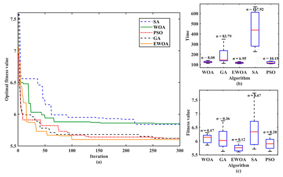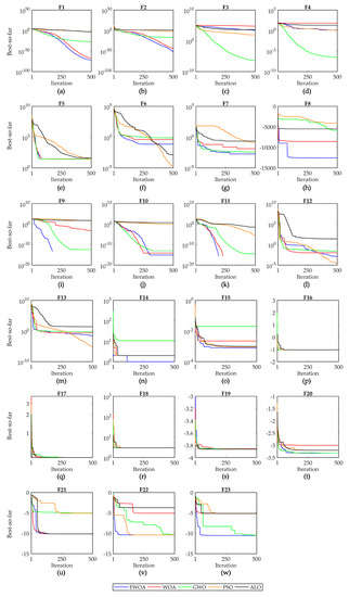 The numerical efficiency of the EWOA developed above in this study was tested on 23 mathematical optimization problems, which are classical benchmark functions utilized in related literature [64,65]. PSO [35], GWO [37], ALO [36], WOA [39] were selected for comparison with the EWOA. For all algorithms, the population size is 30, and the maximum iteration is 500. The 23 benchmark functions are depicted in detail in Appendix B. For each benchmark function, each algorithm was repeated 30 times. The convergence curves of the test are shown in Figure 6.