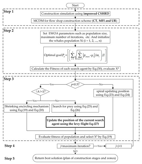 Flow chart of construction stage and zone optimization with enhanced whale optimization algorithm (EWOA).