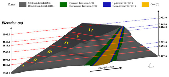 - Wang, R.; Liu, J.; Li, S. Optimization model for substage-zoning filling design of high core rockfill dams. China Civ. Eng. J. 2008, 41, 105–110. [Google Scholar]