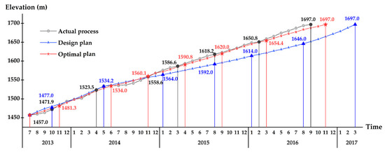 Construction simulation of a high rockfill dam is regarded as an ideal tool to help analyze and plan the dam construction process, due to its advantages of considering the elevation difference constraints of each zone and the restrictions of time and space. Zhong [3] proposed construction simulation of a high rockfill dam (CSHRD) based on CYCLONE. The CSHRD mainly considered the effect of the haulage subsystem and simplified the placement subsystem. Based on the CSHRD, an improved CSHRD that considers the haulage subsystem and placement subsystem by refining flow shop construction is developed and applied [9,10]. Du [9] introduced the improved CSHRD to analyzed flow shop construction and used a genetic algorithm (GA) to optimize the construction stages and zones. Although this research obtained a detailed flow shop scheme while construction stage and zone optimization, a preferable flow shop scheme cannot be selected based on the opinions of decision makers.