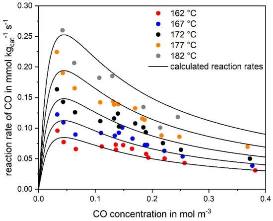 Reaction rate of CO conversion at different CO concentrations (but constant H2 concentration) for different temperatures (marks) compared to the curve fitting according to the Langmuir–Hinshelwood rate expression (solid lines) (0.12–1.4 vol% CO, 55 % H2, rest N2, mcat = 2 g, 162–182 °C, 1 bar).